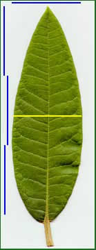 The leaf is broadest below the middle and about three times as long as wide. Rhododendron arboreum.