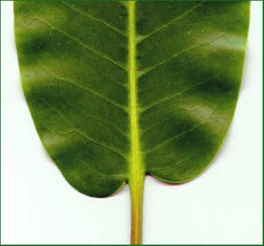with small ear-like projections at the base of the leaf. Rhododendron auriculatum.