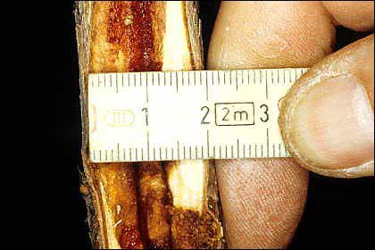 La largeur de sa galerie faisait 1 cm. Cette chenille de "zeuzere du poirier" ne parasite généralement pas les rhododendrons. En 20 ans je ne l'ai rencontrée que 2 fois. Elle parasite plutôt les feuillus : pommier, poirier, prunier, cerisier, olivier etc. Celle-ci ne s'est jamais transformée en papillon, un oiseau m'a remercié.