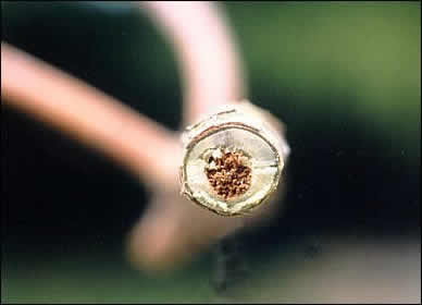 On this picture we can see a part of the sawdust in the gallery. The larva empties the sawdust by a small hole. A small sawdust heap under a rhododendron is the only way to know that a "stem borer" is working. Rather difficult to see, no ? This insect is not common in Brittany despite the fact the pictures were taken in a Brittany garden.